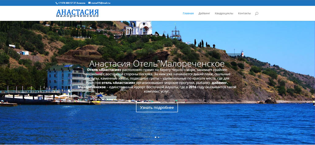 Дайвинг центр в отеле «Анастасия» находится прямо около «дикого» скалистого берега, где любителям подводного плавания есть, что посмотреть. Это самая окраина поселка Малореченское. Дайвинг здесь очень увлекателен, особенно для начинающих дайверов.
